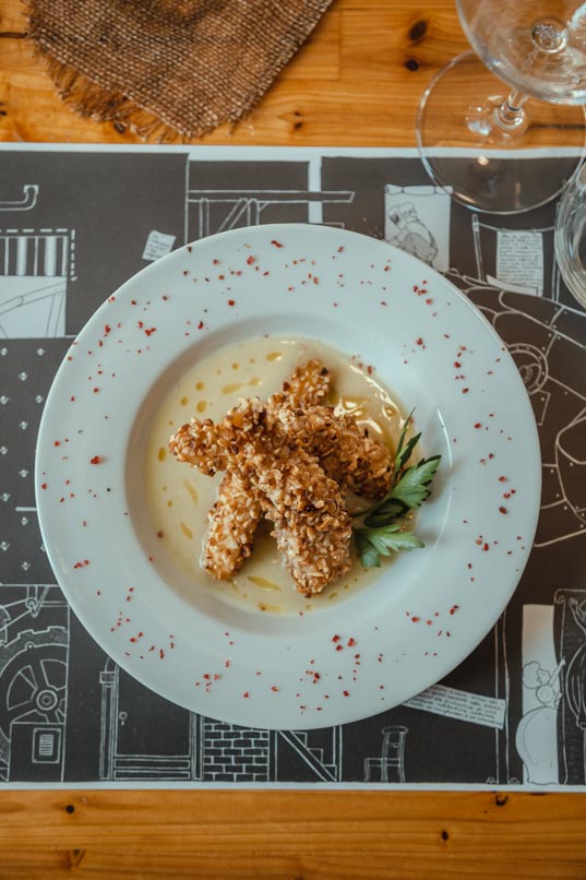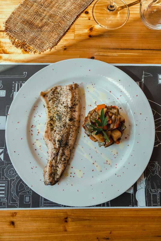 L’impiattamento è ancora più allettante. Alla prima forchettata, c’è stato un qualcosa di magico: lo stesso profumo d’acqua dolce del parco l’abbiamo ritrovato nel sapore del pesce. Lo Chef l’ha proposto in più varianti: versione crunchy, sotto forma di lasagnetta della Domenica, a crudo e la versione al naturale con erbette. Piccolo plus da non sottovalutare: la verdura era cucinata come solo le nostre nonne sanno fare, davvero “tanta roba” (ci sembrava quasi di mangiare a casa della nonna, ma con vista lago).