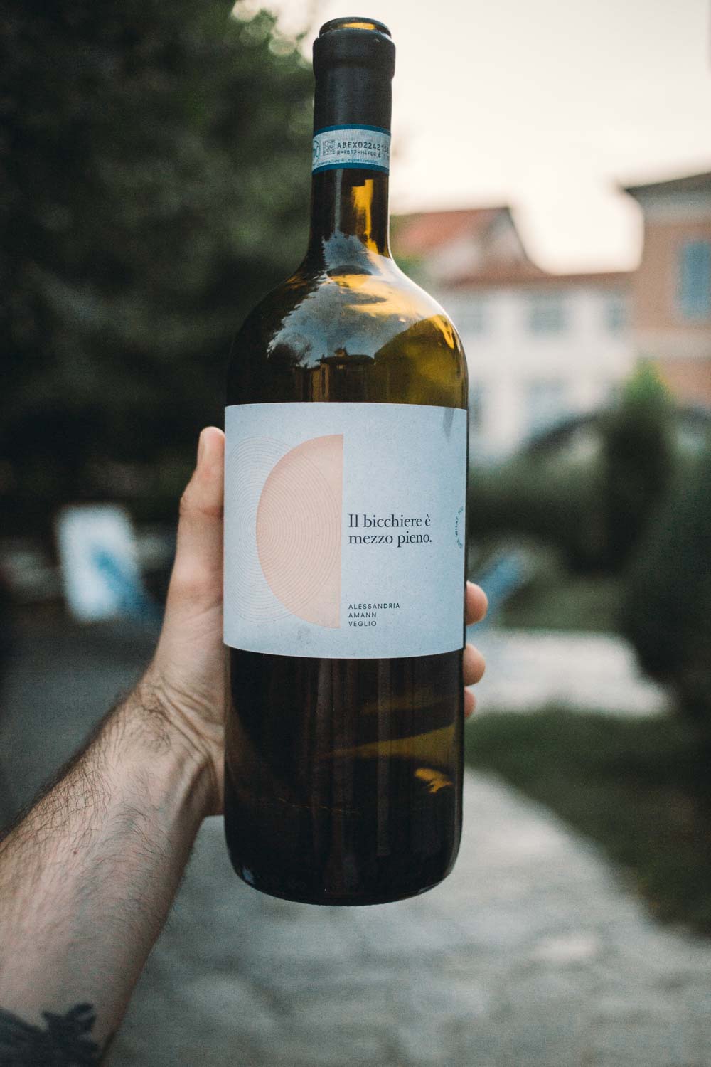 “Il bicchiere è mezzo pieno”, recita l’etichetta. Alla vista di tutto questo minimalismo Fabio impazzisce e comincia a scattare foto a raffica della bottiglia mentre io, con gli zigomi che mi fanno male per il troppo sorridere, penso che non potrei essere più che d’accordo con questa affermazione.