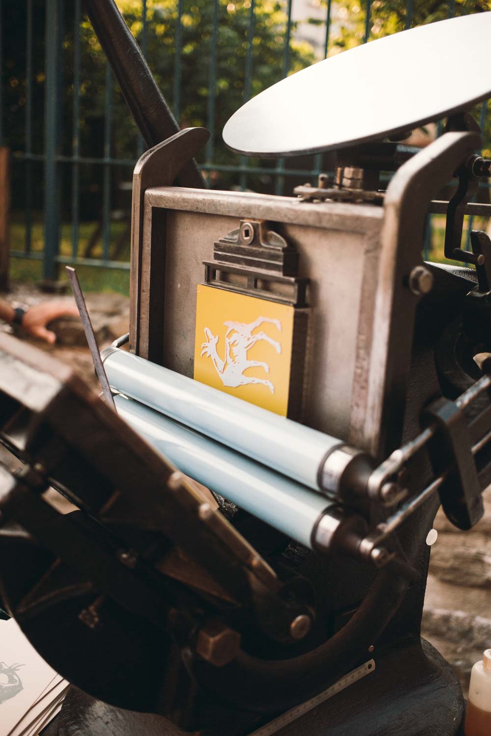 L’etichetta del vino che stiamo sorseggiando ora in piena estasi è stata realizzata in collaborazione con lo studio di Ulla e Fabien, Schneeweis Wittmann: per l’occasione questa coppia di creativi viennesi hanno trasportato la loro 150ennale macchina da stampa manuale da Vienna fino a Dogliani, rendendo questo Print Party ancora più assurdo ed elettrizzante.
