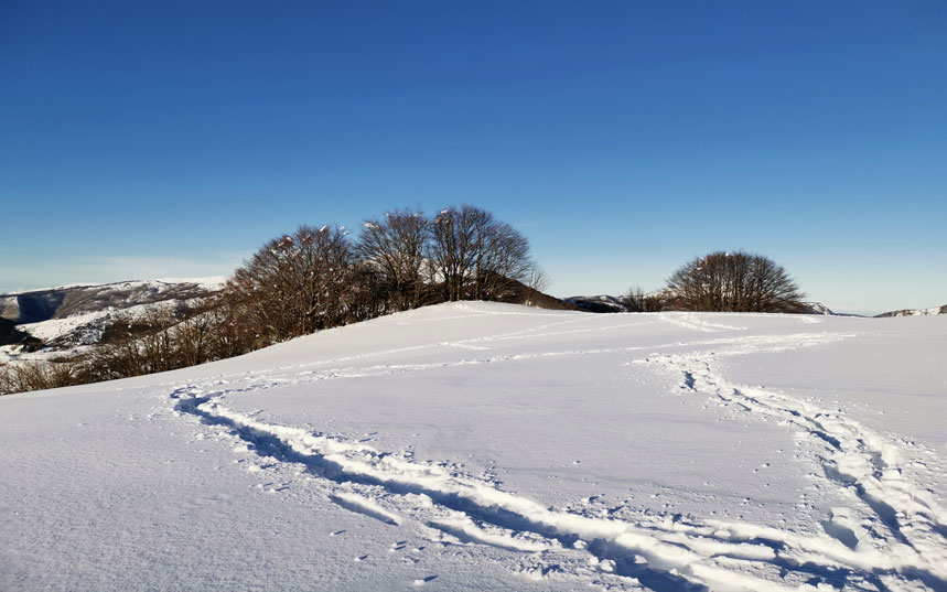Scenario decisamente diverso, ma assolutamente mozzafiato nel Parco del Beigua. Qui ci troviamo su vette innevate decisamente più vicine al mare. Il vento, che spesso soffia deciso da queste parti, gioca con la neve e il ghiaccio offrendo sculture naturali davvero uniche. Dal Passo del Faiallo sono facilmente raggiungibili il monte Réixa o il rifugio Argentea. Altrimenti si può salire in cresta dal paese di Masone attraverso boschi e sentieri leggermente più ripidi. Il paesaggio potrà sembrare a tratti meno fiabesco ma di certo molto avventuroso. Talmente avventuroso che non sarà raro scorgere qualche sciatore intento a sperimentare qualche fuoripista ligure!