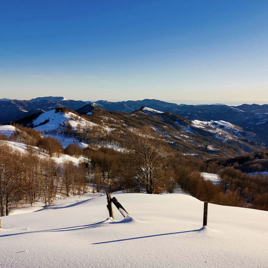 Una delle zone dove in questo periodo è caduta più neve in assoluto è sicuramente l’Alta Val Trebbia. Qui già lungo il viaggio è possibile ammirare distese di fittissimi boschi innevati. La strada statale che conduce in valle costeggia un fiume dalle sponde imbiancate ed è tutto un susseguirsi di paesini completamente ricoperti di neve. In questi luoghi abbiamo infinite possibilità di passeggiate. Possiamo addentrarci nel “Bosco delle Fate” a Fontanigorda, dove la neve rende l’atmosfera ancora più magica. Oppure salire fino alla Casa del Romano e camminare in quota ammirando il mare. Ancora possiamo passeggiare sulle sponde del Lago del Brugneto, o osservarlo dall’alto alla scoperta di qualche paesino che si affaccia su di esso. Insomma, tra boschi, fiumi, laghi e vette, qui troverete neve per tutti i gusti!