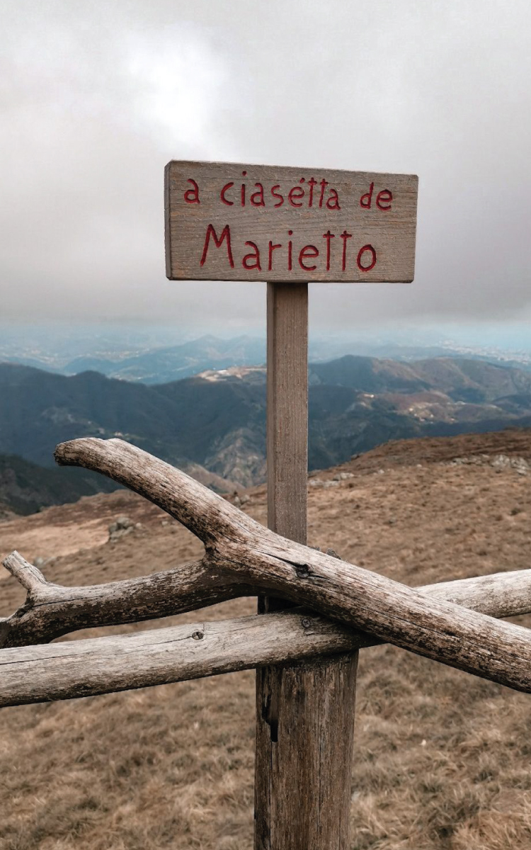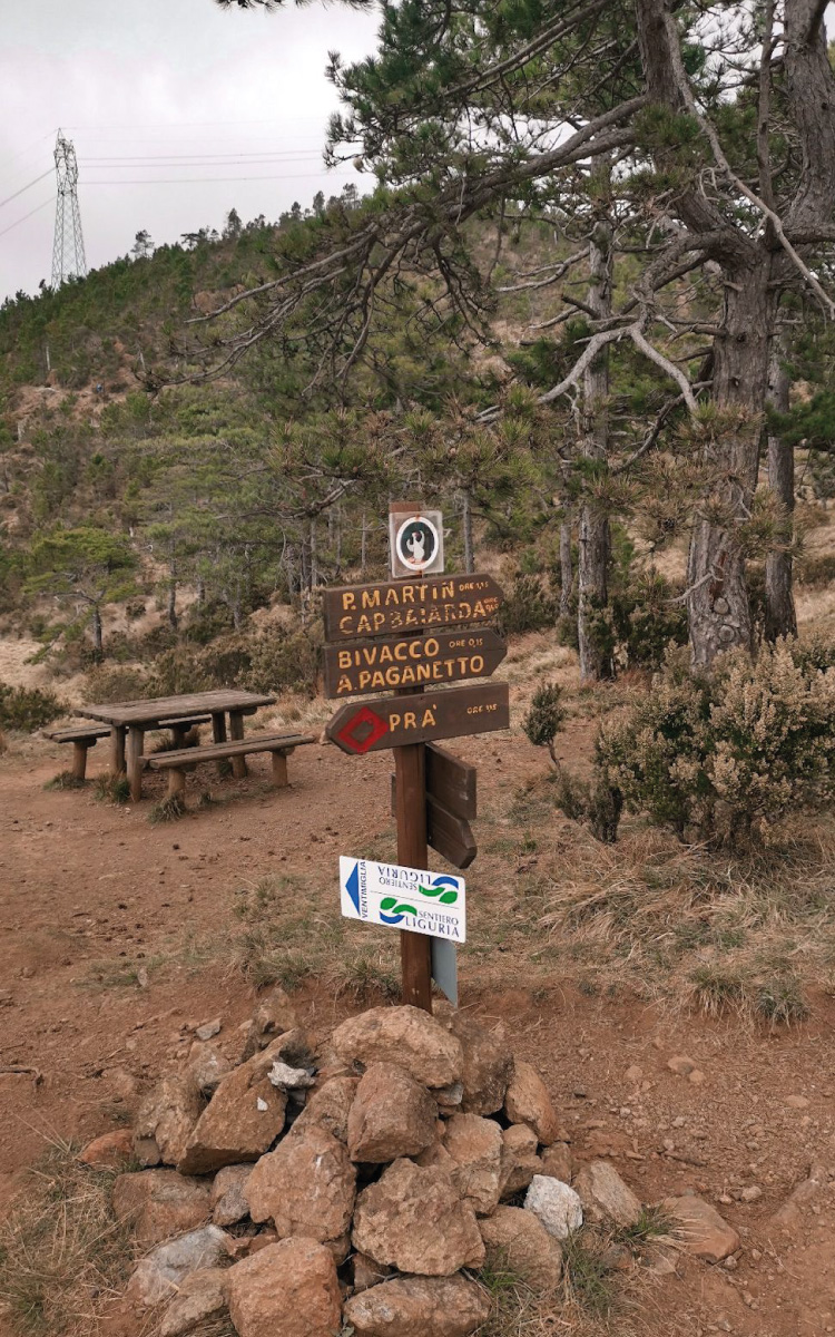 L’unica volta che ero stata a Punta Martin, avevo camminato per ore in una nebbia fittissima, senza vedere praticamente nulla! Mi ero promessa di tornarci in una bella giornata, per capire davvero cosa si prova a guardare il mare da 1001 mt di altitudine. Per questo importante dislivello, abbiamo scelto un percorso semplice ed assolutamente ben segnalato. Siamo partiti da Vignolo, una piccola frazione rialzata da Pegli di circa 150mt, togliendoci così la prima mezz’oretta di strada per uscire dalla parte cittadina. Si può tranquillamente partire da ogni punto di Pegli, e raggiungere a piedi Vignolo seguendo le indicazioni di Google Maps. Da qui si seguono le tracce fino alla vetta, passando attraverso pinete, crinali fioriti, e punti di ristoro attrezzati con tavoli e fonti d’acqua. Alla prima parte nella vegetazione davvero ricca, segue il finale dove sembra di ritrovarsi letteralmente sulla luna. Attraversato il vasto pianoro ai piedi del Bivacco Arnaldo Bellani, si sale l’ultimo ripido ma breve tratto fino alla croce di Punta Martin.
