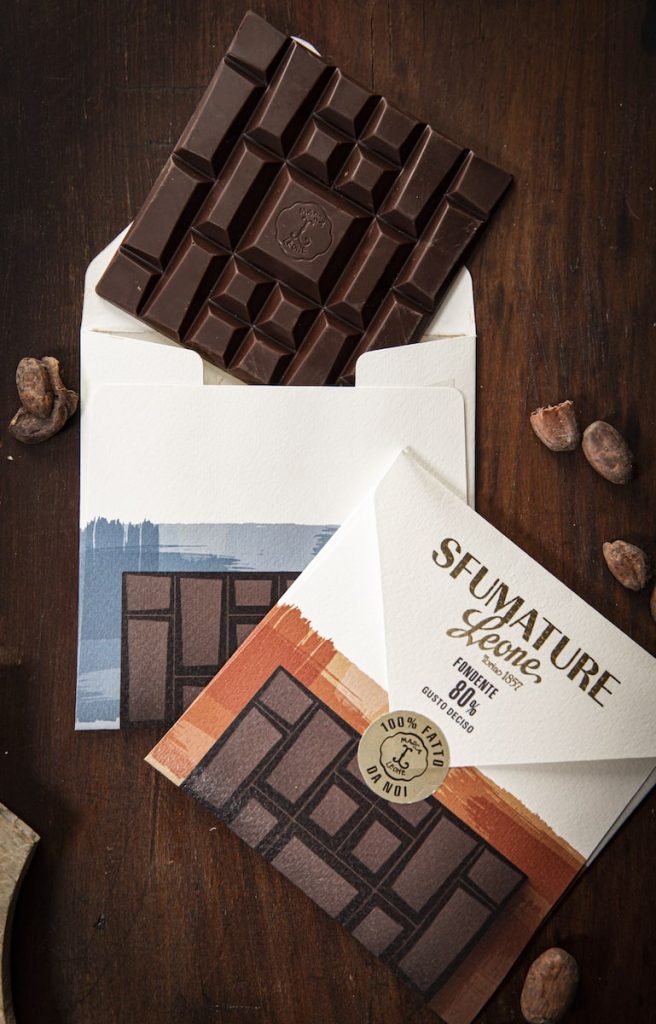 Marca Leone però, e forse questo non tutti lo sanno, è anche cioccolato! Attraversando un paio di porte in produzione infatti si passa dall’aroma di zucchero e vaniglia a quello profondo di fave di cacao tostate. È dal 2019 che Leone ha iniziato la sua produzione di cioccolato ‘bean to bar’, ossia dalla fava alla barretta di cioccolato. Il cioccolato Leone rappresenta e rispecchia tutti i valori della marca Leone: tradizione, semplicità e a regola d’arte. Così il cioccolato Leone viene sviluppato in due linee: Grezzo e Sfumature.