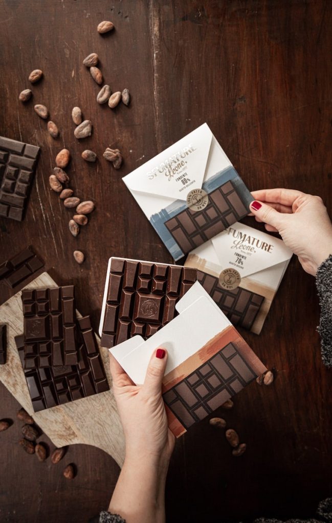 Sfumature è invece la nuovissima (lanciata a settembre 2020) linea di tavolette di cioccolato creta con differenti blend di cacao che da soli danno origine a un ventaglio di sapori, sensazioni e colori. Sei ricette di cioccolato fondente nate dall’incrocio di tre intensità di cacao – 70%, 80% e 90% – e due gusti, Deciso e Delicato a seconda delle fave di cacao selezionate. Queste tavolette sono rese ancora più speciali dalla struttura stessa della tavoletta e dalla confezione: una vera e propria busta da lettera, che funge anche da biglietto d’auguri! La tavoletta è divisa in segmenti di forma e grandezza diversa e ha spessore variabile, più sottile ai lati e più spesso al centro, così da seguire le nostre necessità di degustazione.
