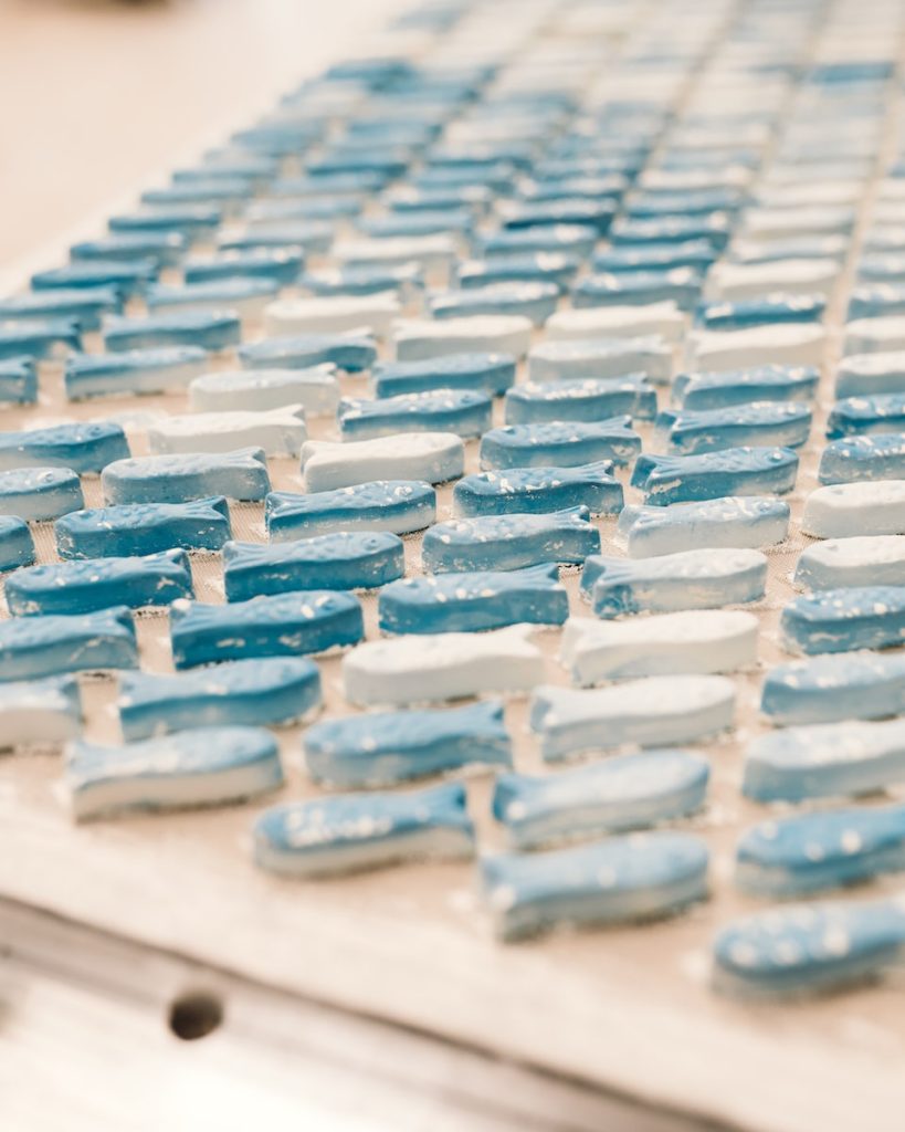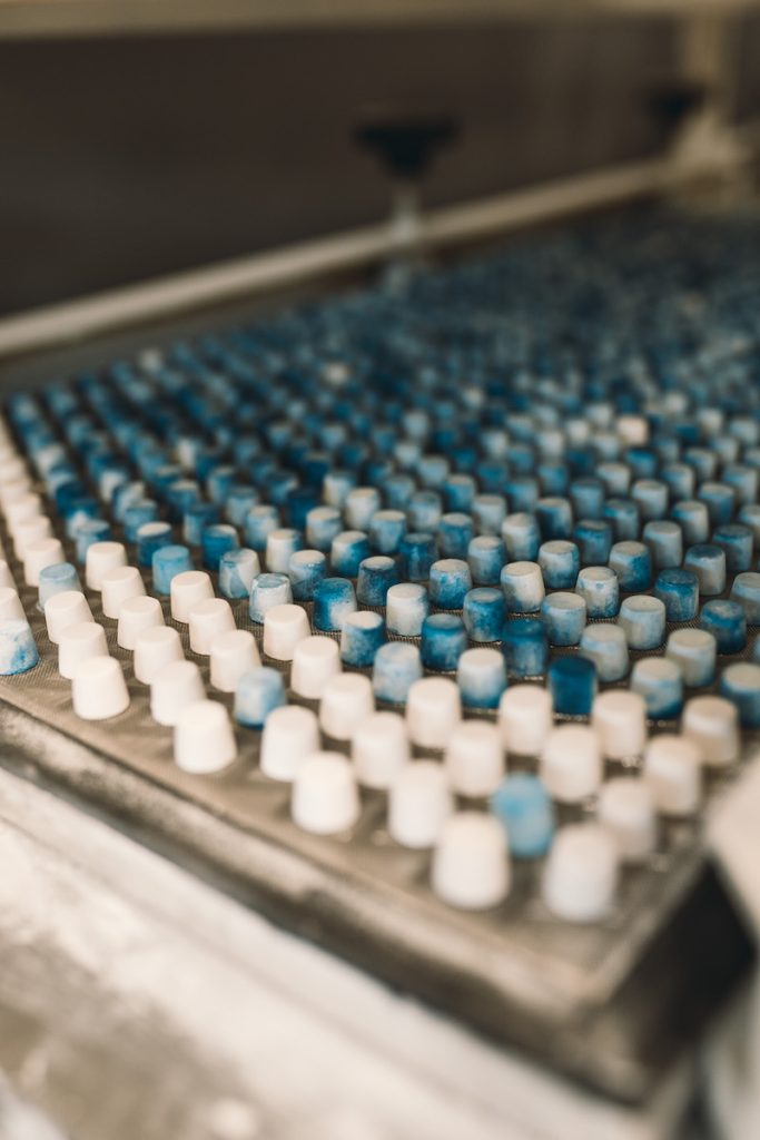 Ci sono le famosissime pastiglie, ancora prodotte oggi seguendo la ricetta originale del 1857. Si parte impastando lo zucchero a velo con i succhi di frutta e gli oli essenziali che servono a dare sapore e colore alla pastiglia. Quando siamo andati noi in visita stavano preparando le pastiglie balsamiche e l’odore di mentolo invadeva tutto l’ambiente! Una volta che tutti gli ingredienti sono ben amalgamati, si trasferisce l’impasto in una macchina che tira la sfoglia di caramella che poi passa in un rullo dove gli antichi stampi in bronzo, ancora marchiati con la “L” di Leone, tagliano i famosi cilindri di impasto. Successivamente le pastiglie vengono messe nell’essiccatoio dove asciugano per circa 24 ore! Quanti gusti di pastiglie Leone esistono? Infiniti!! O meglio ne esistono circa 40 che vanno dai più classici come violetta, anice e menta, ai più creativi quali assenzio o torta al cioccolato. Ma in realtà la fabbrica Leone è sempre aperta a sperimentare nuovi gusti e nuovi sapori, per esempio esistono le pastiglie a gusto Spritz! Per un aperitivo ancora più divertente!