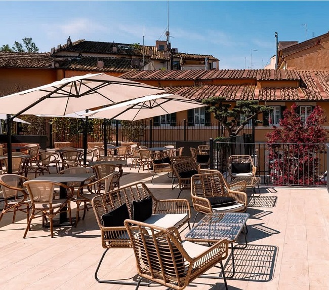 Quando abbiamo scritto questa guida sulle più belle terrazze di Roma, ci è risuonata nella testa la famosa canzone di Antonello Venditti “Roma Capoccia”, un inno alle tante meraviglie della nostra città, che celebra la bellezza dei sette colli, del Colosseo, del cuppolone, di un fiume che scorre e il sole che rosseggia al momento del tramonto. Siamo certi che il buon Venditti abbia scritto questa canzone guardando la città dall’alto, magari proprio su una terrazza. E allora su il volume, che intanto noi vi guidiamo tra le nostre terrazze preferite di Roma! [caption id="attachment_79281" align="aligncenter" width="1981"] Foto © Hotel Locarno[/caption]