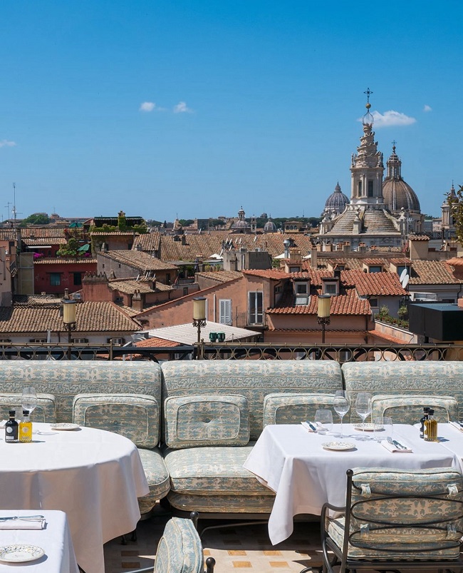 L’albergo si sviluppa in due edifici gemelli, regalandoci così due spazi distinti da vivere: Terrazza Locarno con una meravigliosa vista su Trinità dei Monti, un’elegante sala da pranzo outdoor caratterizzata da sedute in ferro, e dall’altro lato la nuova esclusiva Terrazza Canossa, un’oasi verde “a picco” su Piazza del Popolo. Le protagoniste indiscusse della terrazza sono infatti le due cupole di Santa Maria in Montesanto e Santa Maria dei Miracoli, bellissime e incredibilmente vicine.