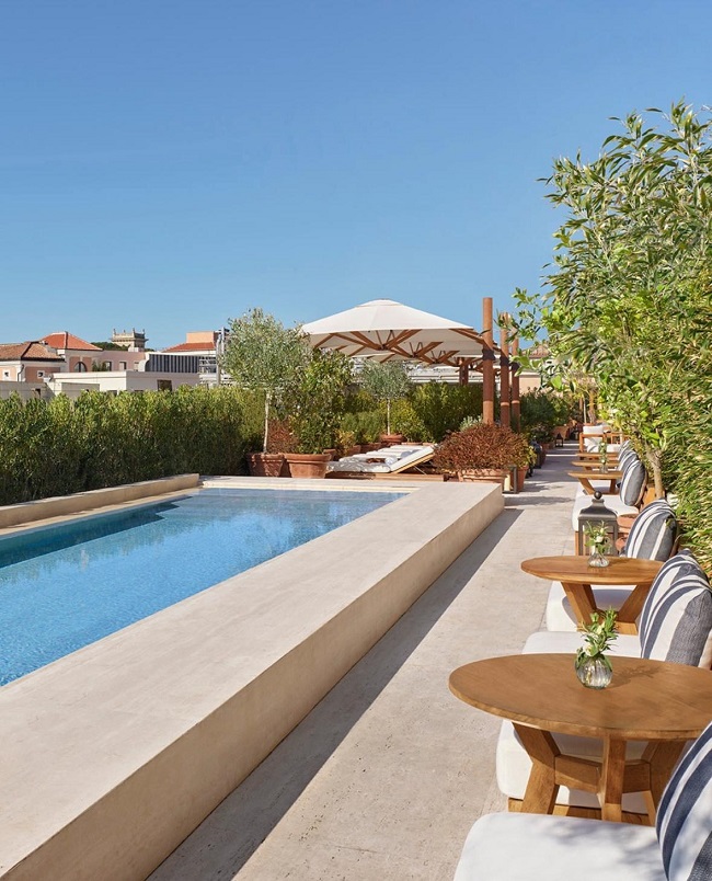 Una piscina in travertino, comodi lettini e un’area bar ampia e luminosa fanno da cornice a momenti di puro relax, tra un cocktail d’autore e una selezione di piatti mediterranei rivisitati con gusto contemporaneo. L’atmosfera è vibrante ma raffinata, con un design curato nei minimi dettagli che regala quel tocco cool senza rinunciare all’anima romana. Qui ogni sapore racconta una storia di sole, mare e tradizione: è come assaporare l’estate, un sorso alla volta.