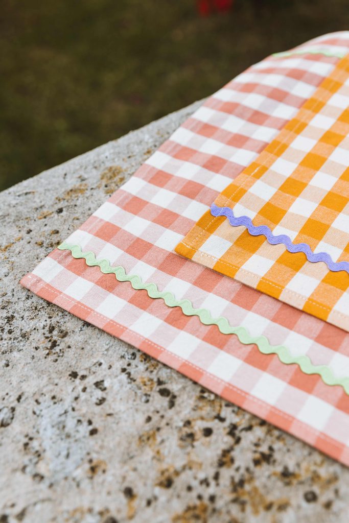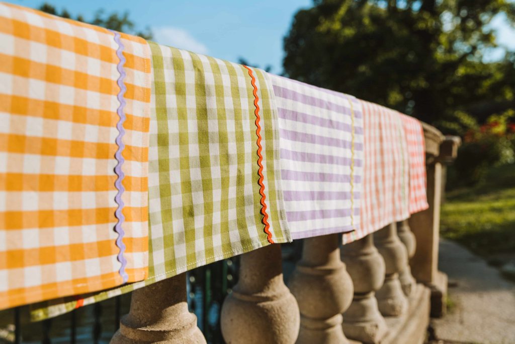 Il materiale che loro hanno scelto è il vichy di cotone (di cui si riforniscono in zona) e la fantasia è quella intramontabile da pic nic che è difficile non amare! Le tovagliette sono poi arricchite da applicazioni in tessuto che le rendono uniche e romantiche. Vengono cucite artigianalmente da un laboratorio qui a Milano che le crea una ad una in base alle indicazioni di Federica e Chiara.